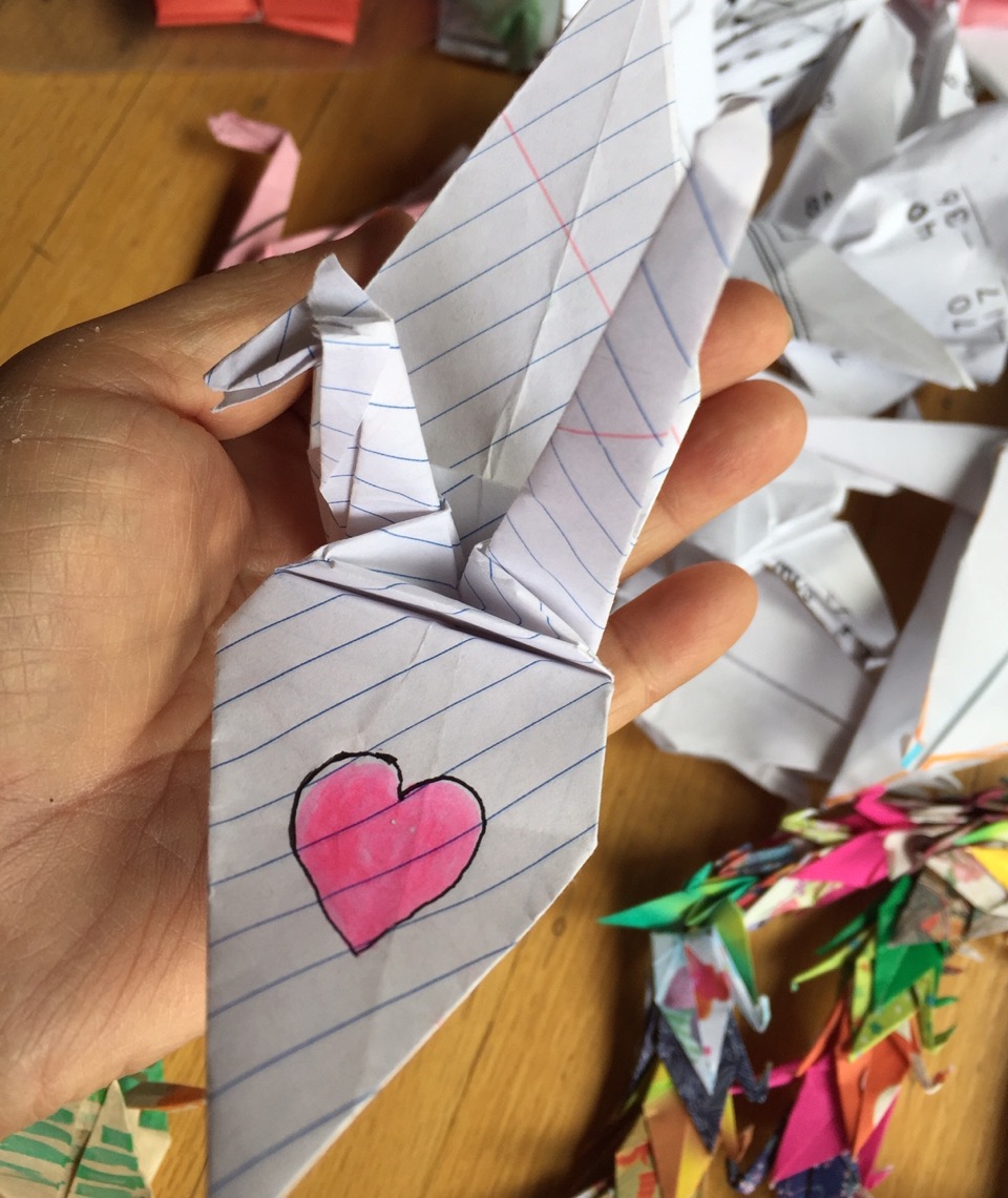If you make multiple cranes, please be so kind as to string the cranes – using thick, strong thread with no spaces between each crane of a length no more than 4 feet– before mailing them. If you can make a string of cranes in increments of 50 or 100, that would be optimal, but any number of cranes will be very deeply appreciated. If your community makes a large number, please make a note of the total.